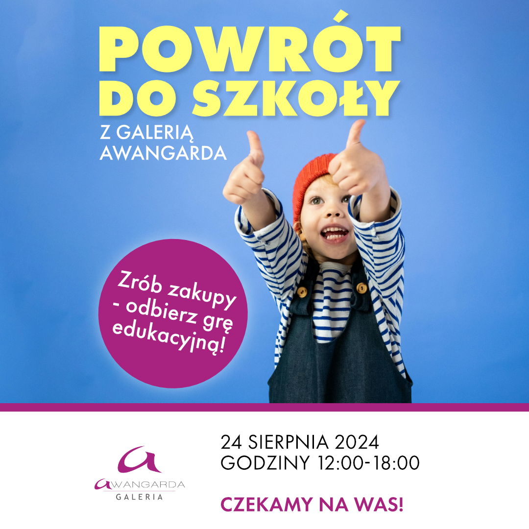 Powitaj nowy rok szkolny z Galerią Awangarda! 🏫 Rozpocznij szkolne przygody z uśmiechem i fantastycznymi nagrodami! 🎁 Już 24 sierpnia w godzinach 12:00 – 18:00 zapraszamy na naszą akcję „Back…